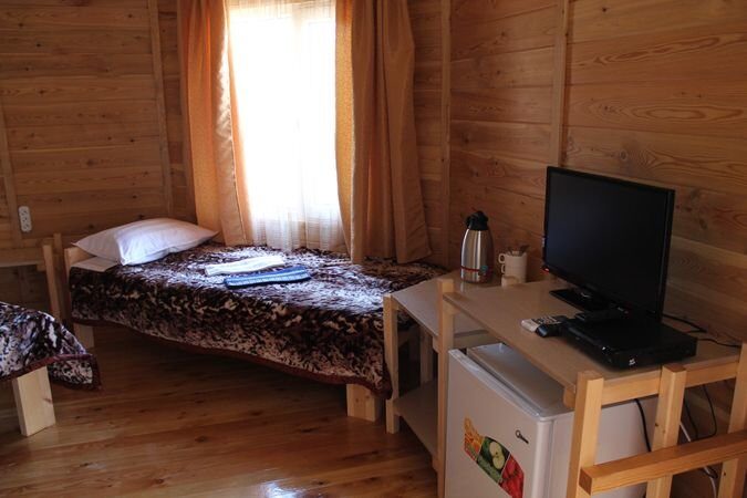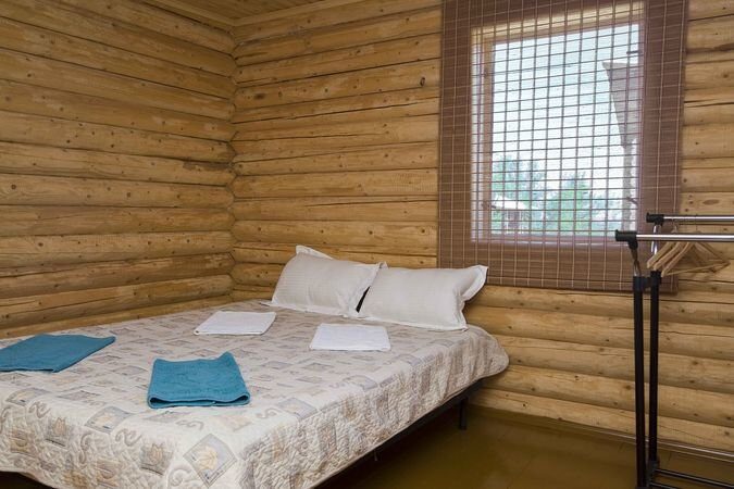 Однокомнатные номера расположены в блокированном корпусе - срубе. В номере: один санузел с душевой на два номера, двуспальная кровать, вентилятор, стол, стулья, тумба, набор чайной посуды. Общая площадь номера 17кв.м., площадь спальни 14 кв.м. |