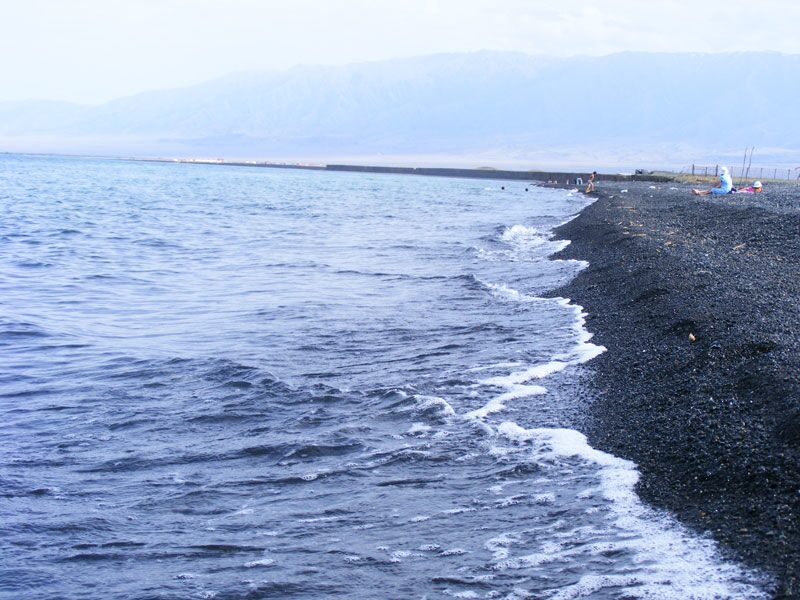 Галечный. Собственный, в 450 метрах. Пологий и широкий. Понтонный мост до косы.