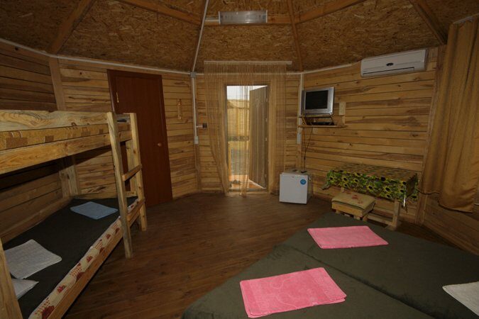 Отдельно стоящий домик, 1-а комната, 7 секций. Площади: секция – 6 кв. м., зал – 19 кв. м. В секции: 2-е кровати, столик, под одной из кроватей, ниша для хранения. В зале: стол, лавки, набор чайной посуды. Душ и туалет на территории. |
